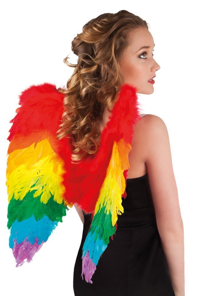 Rainbow Feather Angel foldable wings measuring 50cm x 50cm.