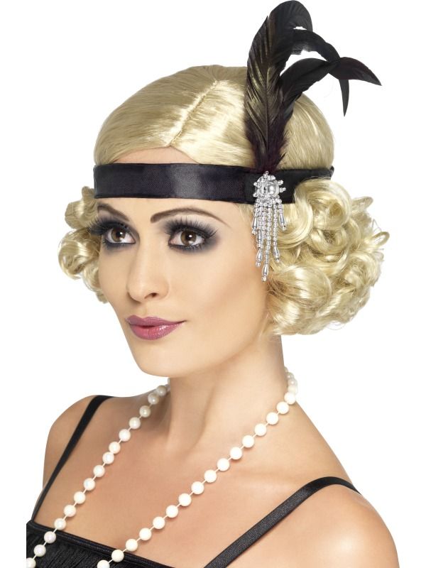 Step back to the roaring twenties with this stylish black satin Charleston Headband with attached black Feather and silver Jewel Detail.