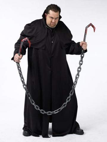 Blood soaked hook with attached chain link costume accessory. Hook and chain measures approx 70" long.
