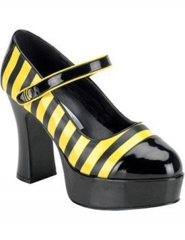 Black and yellow Buzzy bee platform shoes with velcro closure. Shoes have a 4" heel.