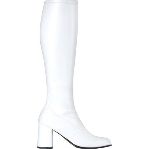 White patent wide calf knee high Go Go Boots with side zip closure. Boots have a 3" heel.