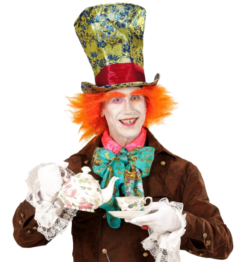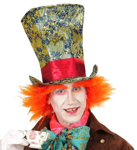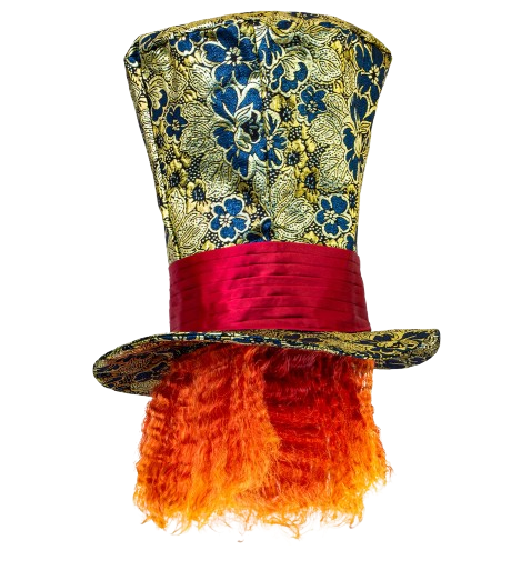 Step into madness with the Crazy Hatter Top Hat—complete with wild hair.