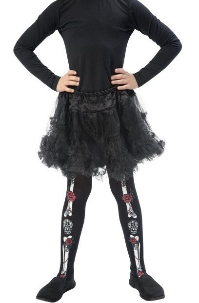 Kids Day of the Dead Tights, black with skeleton and rose print.
