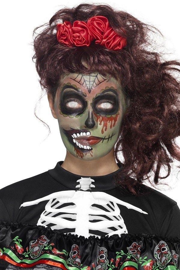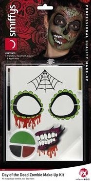 Day Of The Dead Zombie Make-Up Kit includes multi-coloured transfers, face paints, crayon and a make-up applicator.