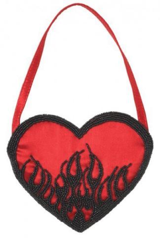 The Devil purse is perfect for complimenting your Halloween costume. It is a red, heart shaped back with black beading detail and button closure.