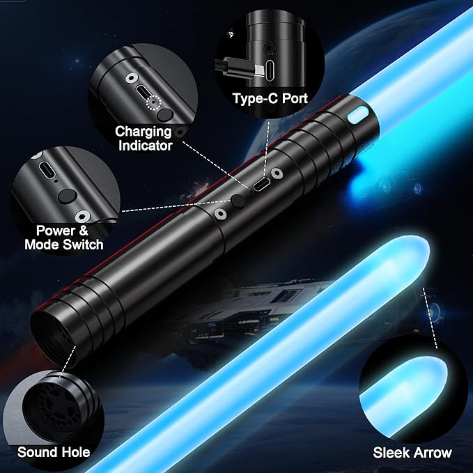The Type-C interface can quickly charge the lightsaber. (Charging cable included).