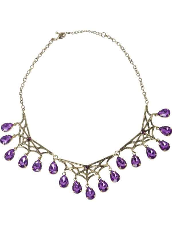 Gothic Manor Spider Web Necklace bronze with purple gems.