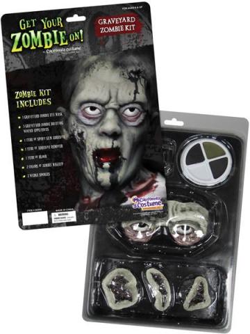 Graveyard Zombie Kit includes two cream makeup colours, 1/4 oz of blood, 1/8 oz of spirit gum, 1/8 oz of remover, 2 makeup sponges, eye mask and 3 wounds.