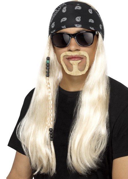 Hard Rocker Kit includes a long blonde wig with an attached wig cap and a white Beard. Also included is a pair of glasses and a bandana.