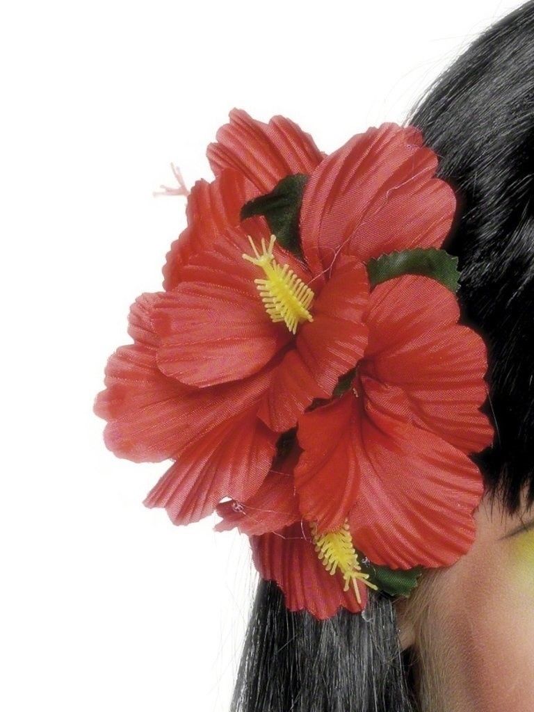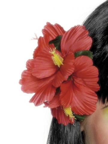 Complete your Hawaiian themed costume with our Hawaiian Hair-Clip flower. Red in colour with green leaves and a clip to hold the piece securely onto your head.