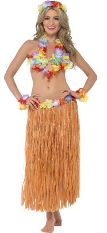 Hula Honey Instant Kit includes a skirt with flower wait trim and a flower bra. Also included is a flower headpiece and wrist cuffs. To complete the look a flower lei is also included.