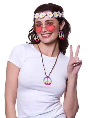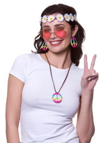 Spread some peace, love and harmony with this funky Hippie Set. This Hippie set includes detailed flower headband, gold glasses, clip on multicoloured earrings and medallion. The accessory set is guaranteed to make your costume look extra groovy!