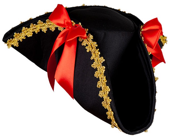 Search for buried treasure in our Ladies Tricorn Pirate Hat. This hat is black in colour with a gold trim and red ribbon detailing.