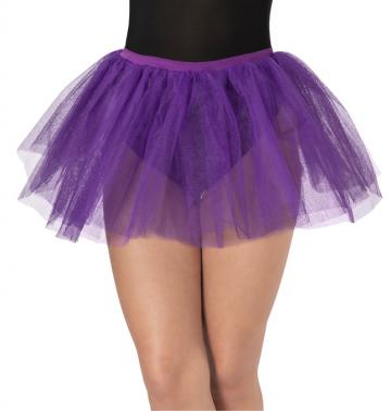 This layered purple mini tutu has an elasticated waistband attached to layers of netting.