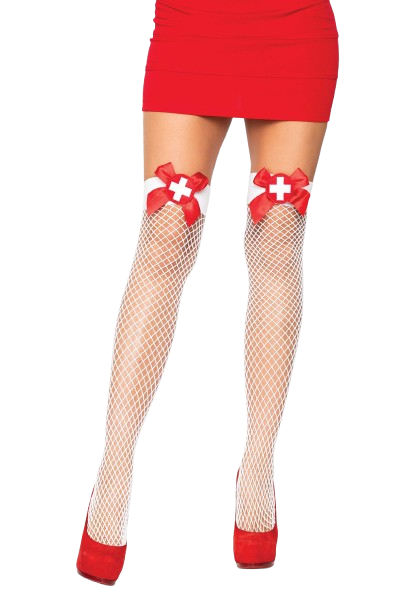 Get ready to play doctor with these flirty Net Thigh Highs, complete with an adorable bow and a nurse badge.