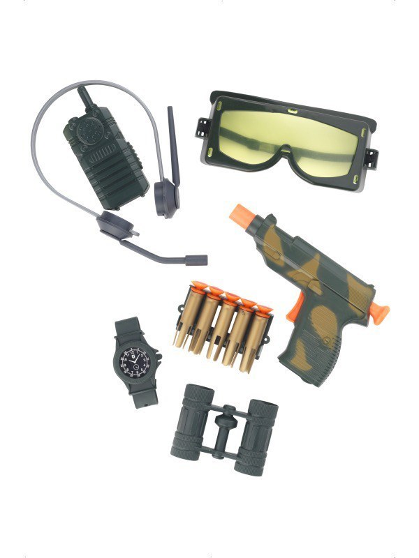 Peace Keepers deluxe gun set includes a pistol, bullets, glasses, watch, radio, ear-piece and binoculars.