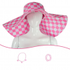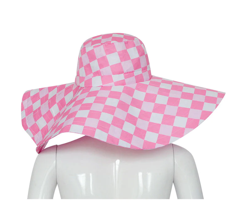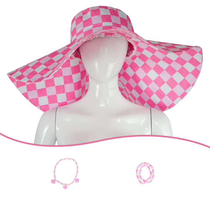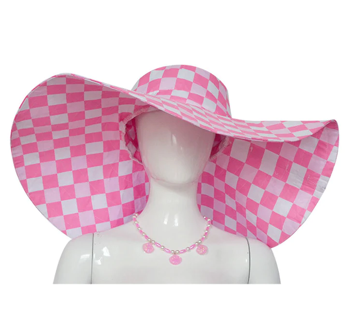 Included is an oversized pink and white chequered hat, a pink clam bracelet and a pink clam necklace.