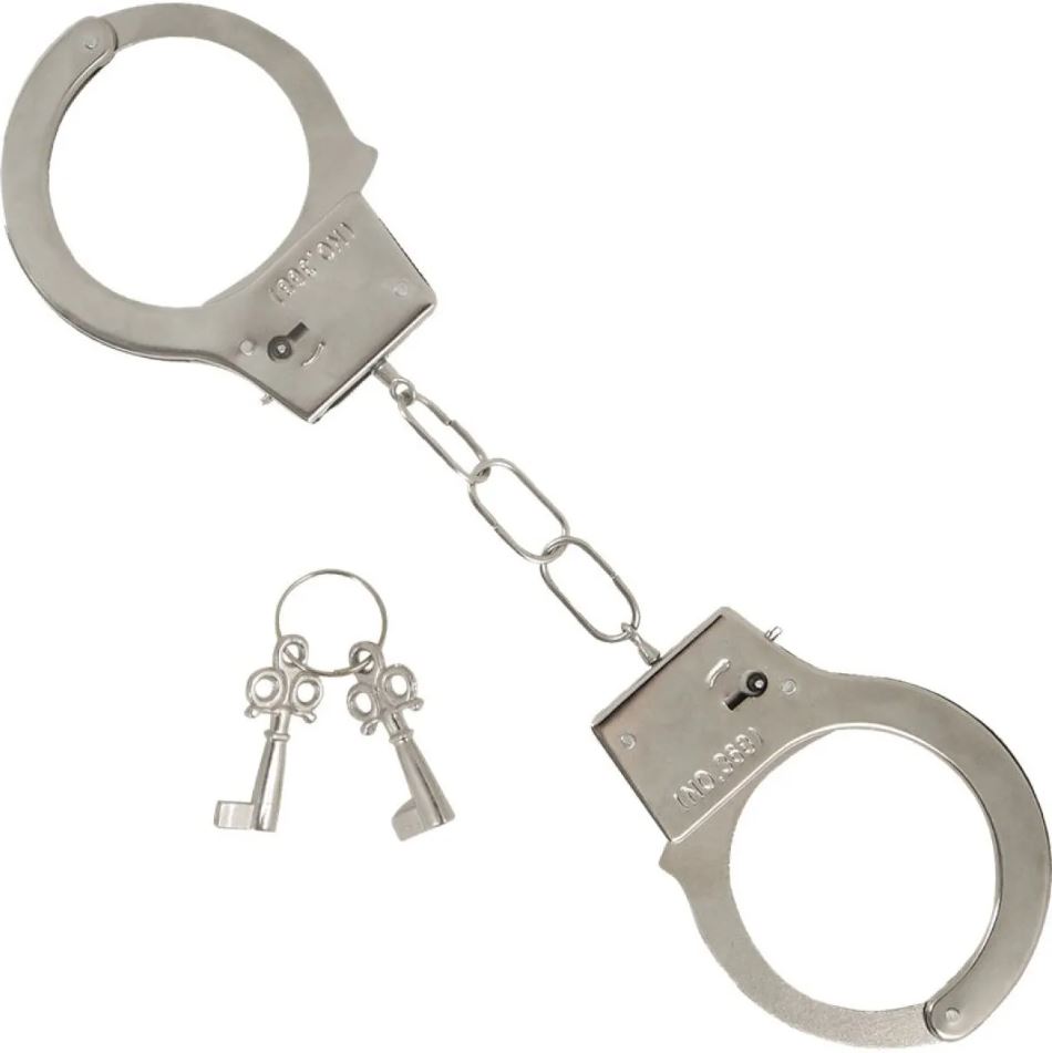 This set includes two sleek silver handcuffs with two attached keys for an authentic touch.