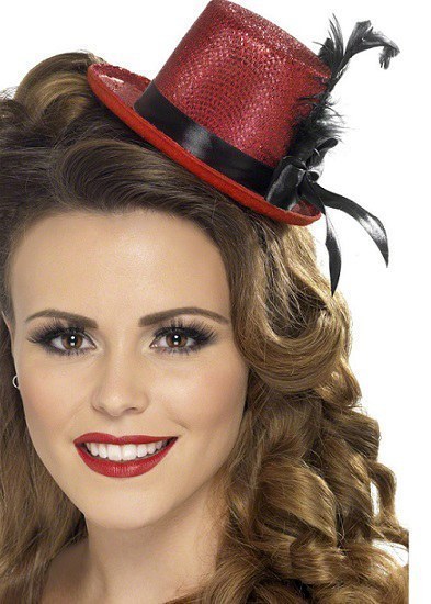 Excellent quality, glistening red mini top hat with black ribbon and black feather detail.