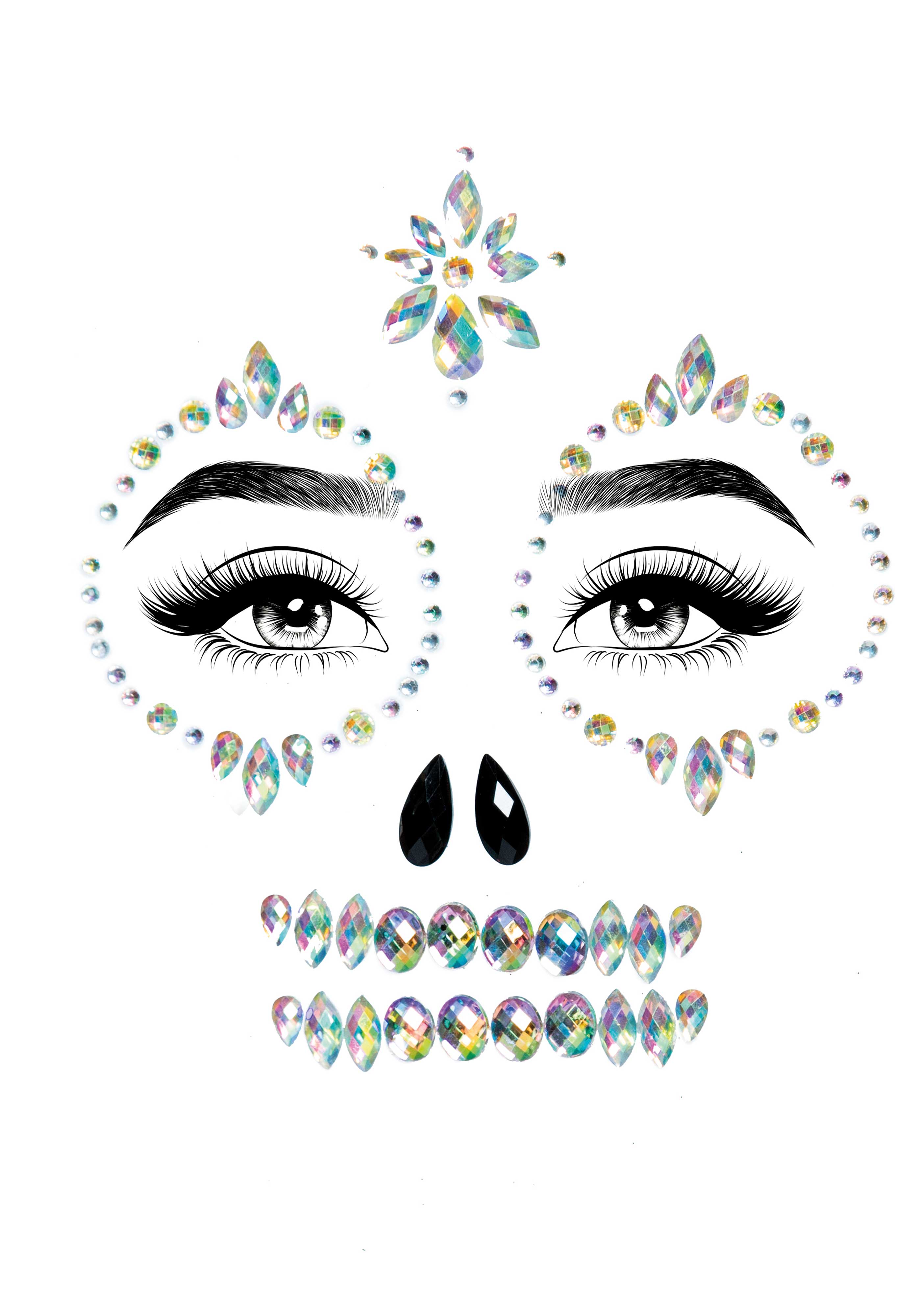 Skeleton adhesive face and chest jewel stickers. Easy to apply; loosen the jewel from the backing and place on the desired spot on the skin and apply medium pressure. You don't need extra glue. Tested and bodysafe.