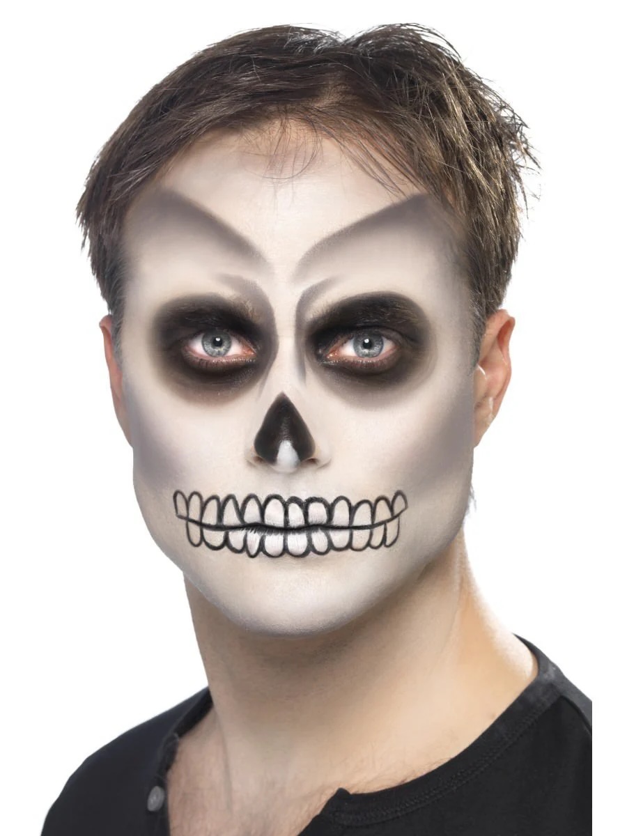 Skeleton Make Up Greasepaint Kit includes white and black facepaint, black crayon and make up sponge for completely authentic skeleton make up. The makeup can be easily applied as well as removed.