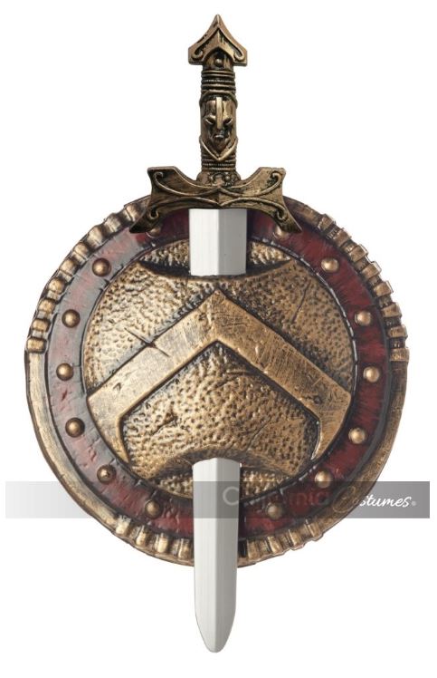 This is Spartan Combat! This styled shield and sword combo can be stowed together for convenience. Shield is 12" in diameter
