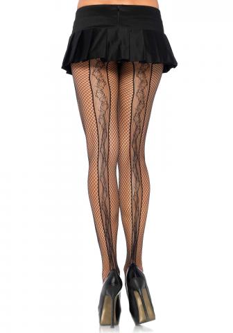Black Fishnet pantyhose with wide trellis lace trim backseam.