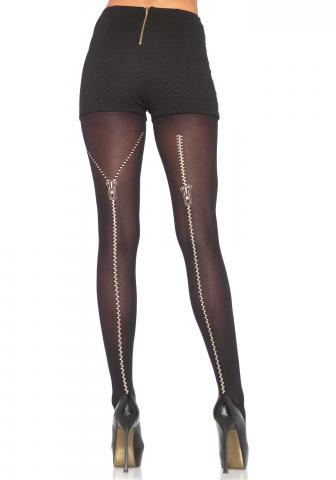 Black Opaque Metallic Zipper Print Backseam Pantyhose.