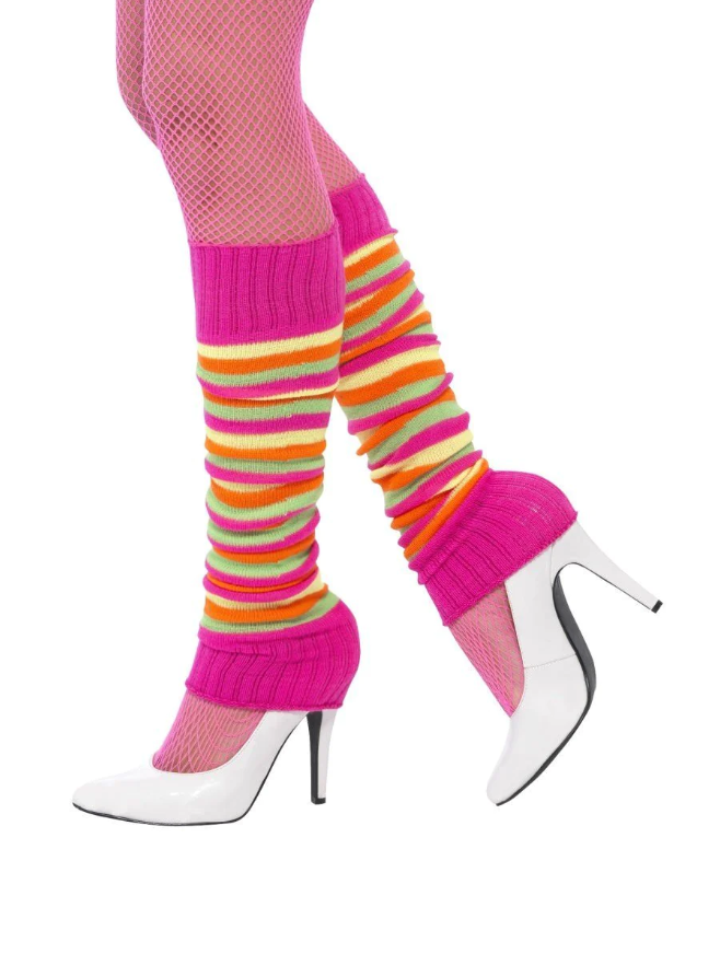 These leg warmers feature a neon green, neon yellow, neon orange and neon pink striped look.