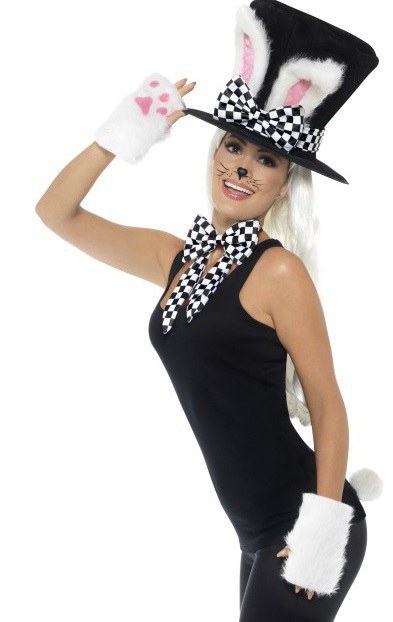 Tea Party March Hare Kit includes a black and white Top Hat with rabbit ears and a pair of faux fur fingerless gloves. Kit also includes a black and white bow tie and a white bunny tail.