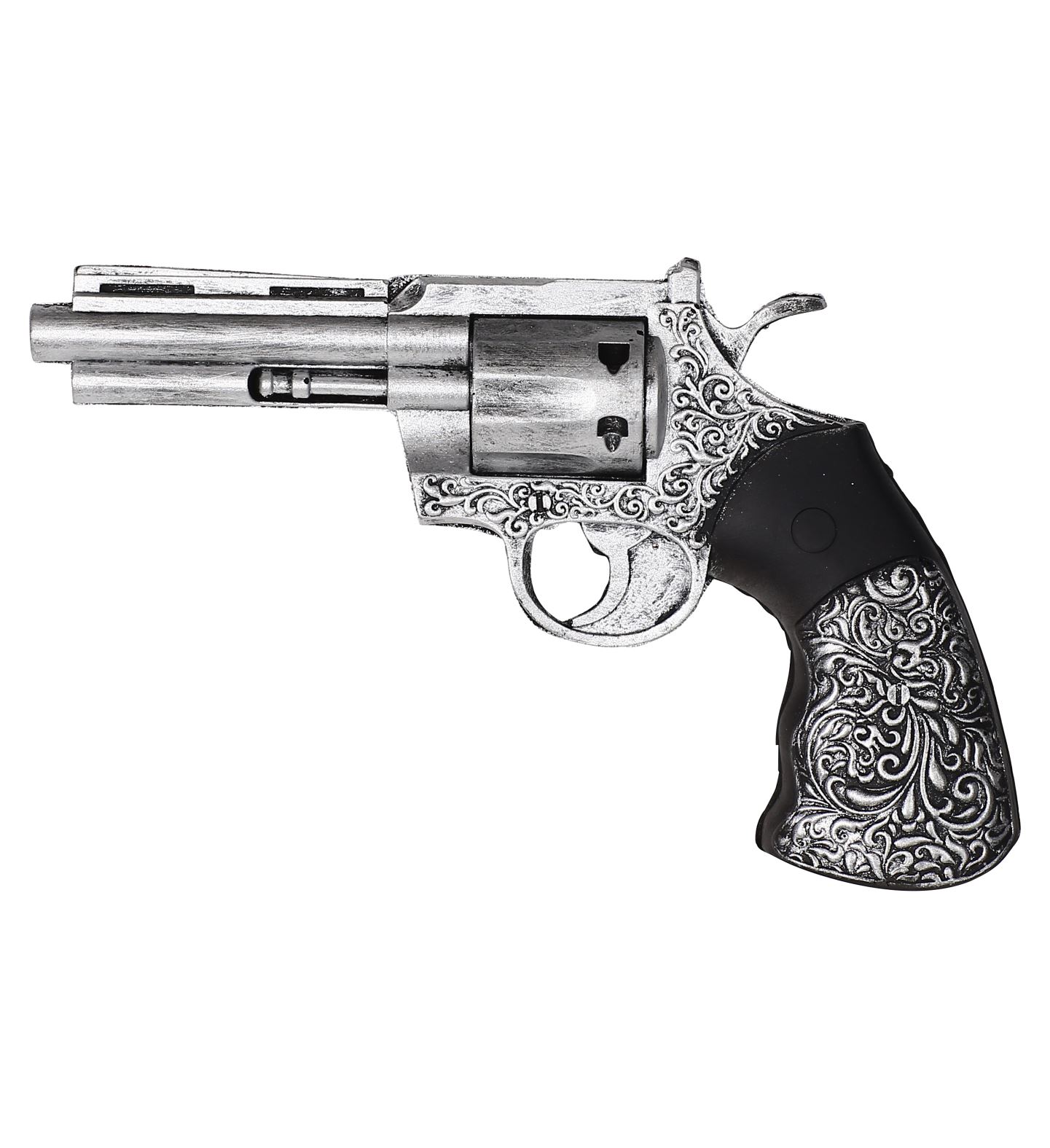 This Authentic looking latex revolver is 25cm and is a great addition to many costumes like cowboy, steampunk, mob and cops