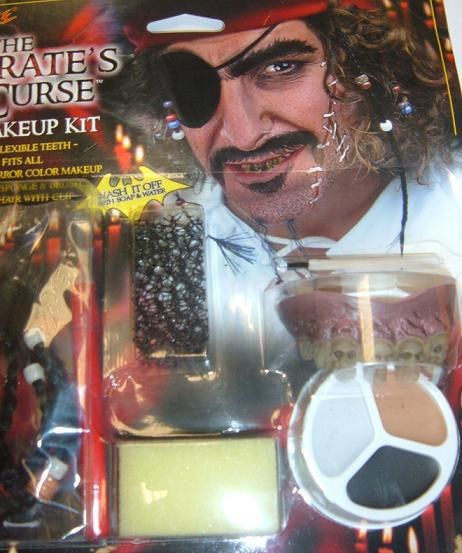 Pirate's makeup kit includes soft and flexible false teeth (one size fits all) safe horror color makeup, sponge and brush.