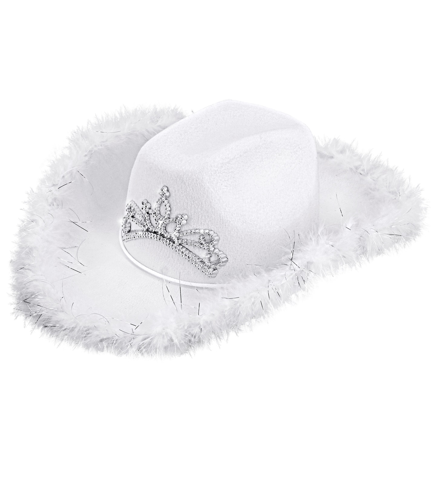 This white cowgirl hat features an attached tiara and a marabou trim.