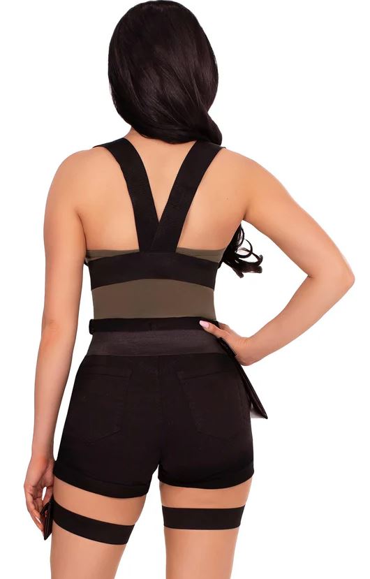 The attached thigh garters add a bold edge, while sleek black webbing and buckle details complete the statement look—perfect for themed events, festivals, and standout costume styling.