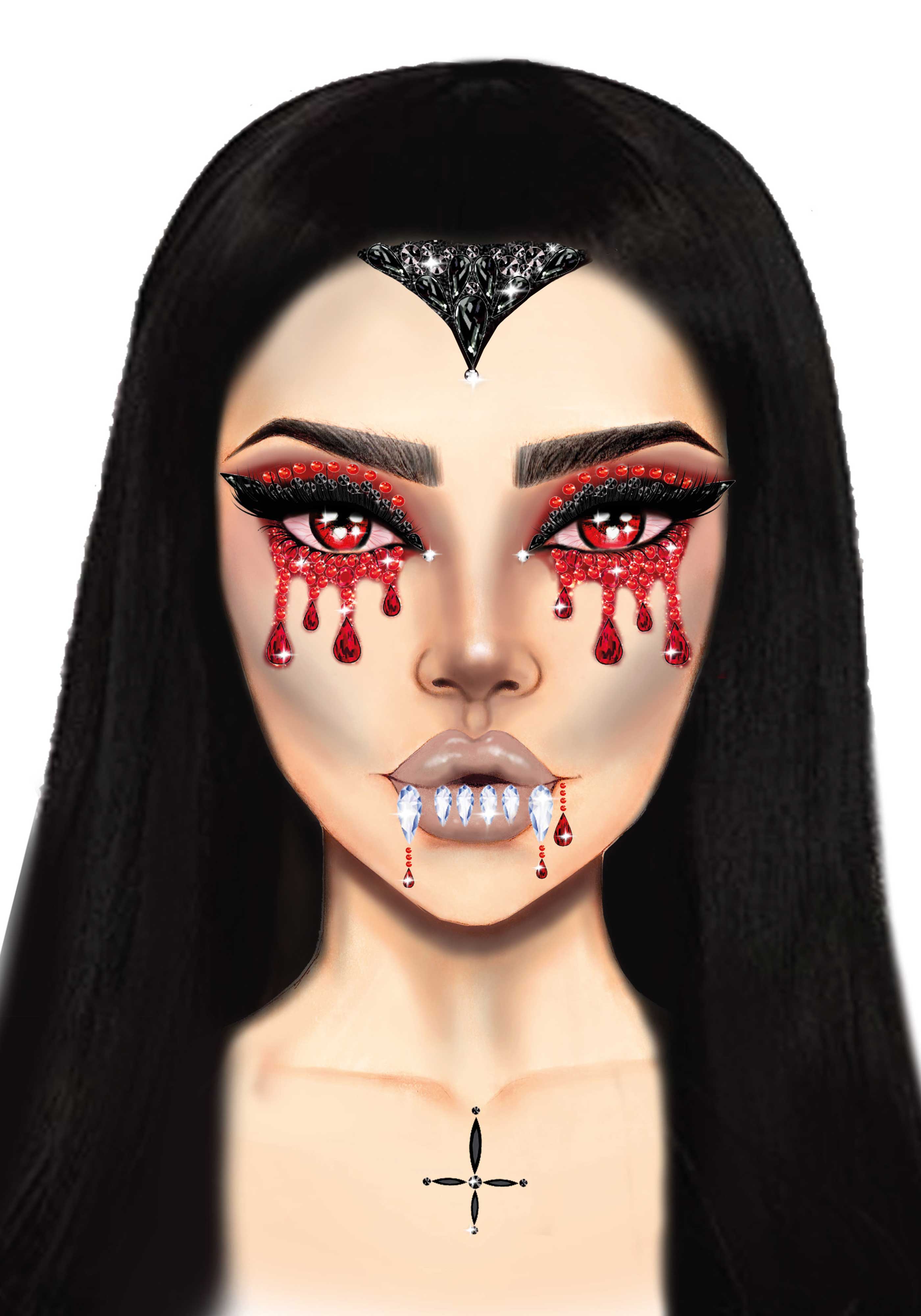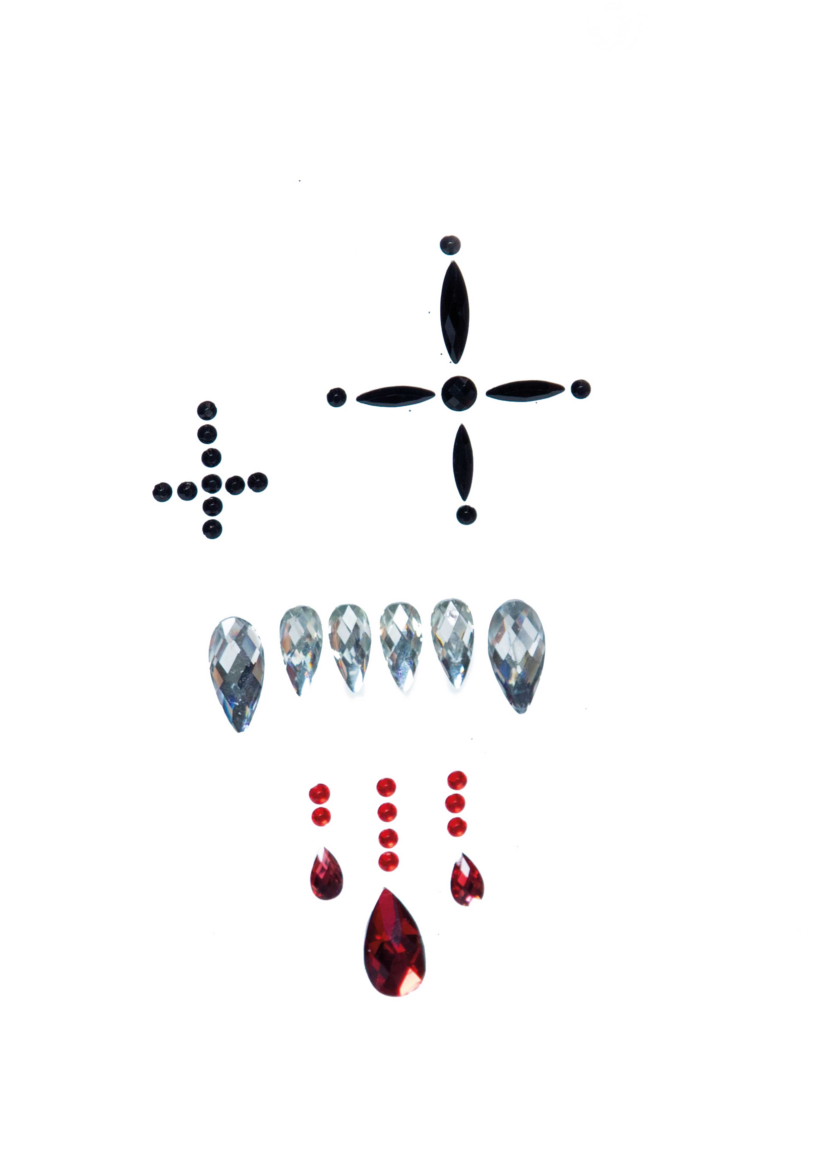 Vampire adhesive face jewels sticker. Easy to apply; loosen the jewel from the backing and place on the desired spot on the skin and apply medium pressure. You don't need extra glue. Tested and bodysafe.