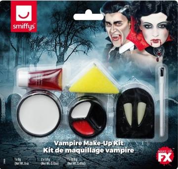 Vampire Make Up Greasepaint Kit includes make up sponge, a tube of fake blood, white, black and red face paint and fangs to finish off the look. Also included is a make up brush for accurate application. The makeup can be easily applied as well as removed.