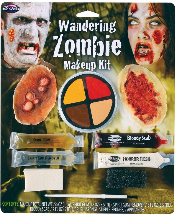 Wandering Zombie Make-up Kit includes spirit gum, spirit gum remover, horror flesh, bloody scab, brush, sponge, stipple sponge, 2 appliances and 4 colour paints.