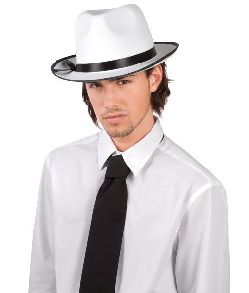 Complete that 20's look with this White Felt Al Capone Hat This white gangster hat includes a black ribbon trim detail.