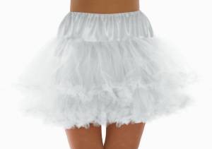This layered white petticoat has an elasticated waistband attached to layers of netting.