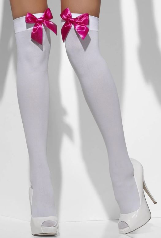 Add a playful and eye-catching touch to your outfit with these stylish White Stockings with Fuchsia Bows. Featuring a classic thigh-high white design, these stockings are finished with bold fuchsia pink bow details for a fun and feminine look.