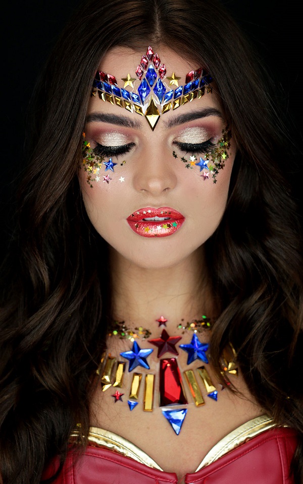 This unconquerable warrior is the fierce feminist icon of them all. Shop the gold, red and blue face jewel here to complete your Wonder Woman Halloween Makeup look.