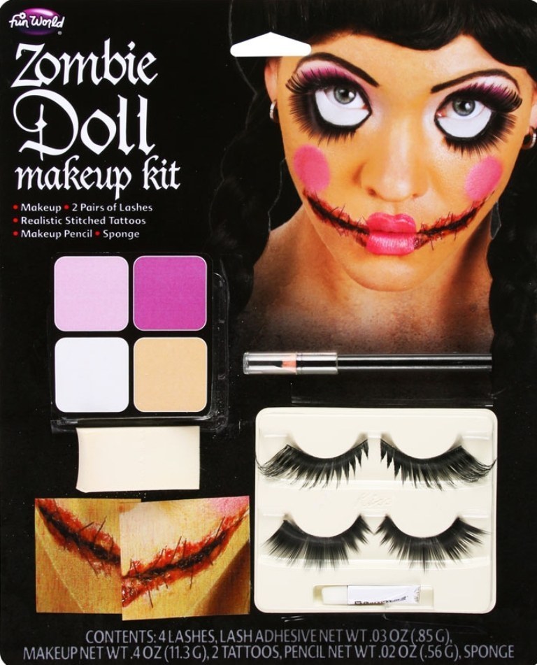 Zombie Doll Makeup Kit includes a makeup palette, 2 pair of eyelashes, sponge, pencil and tattoos.
