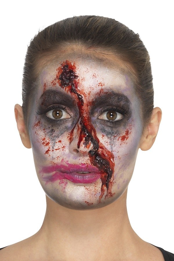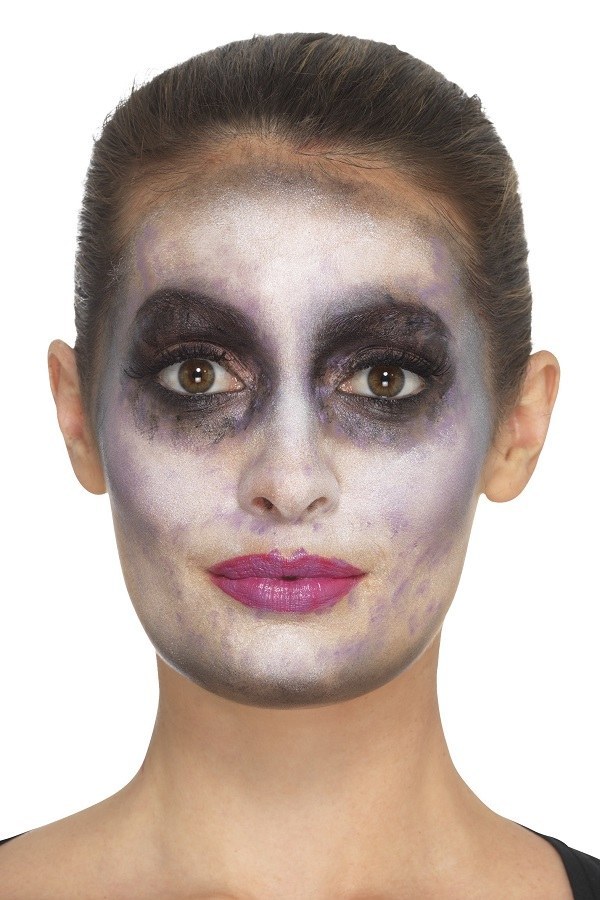 Zombie Nurse Make-Up Kit includes a makeup tray (Purple, black, light brown, dark brown) fake blood, brush, sponge and nurse headband.