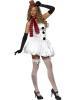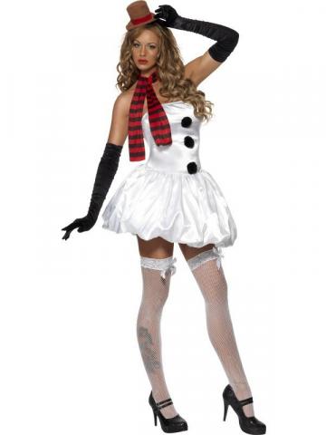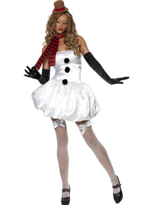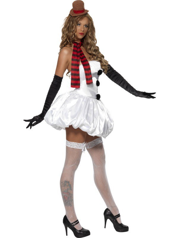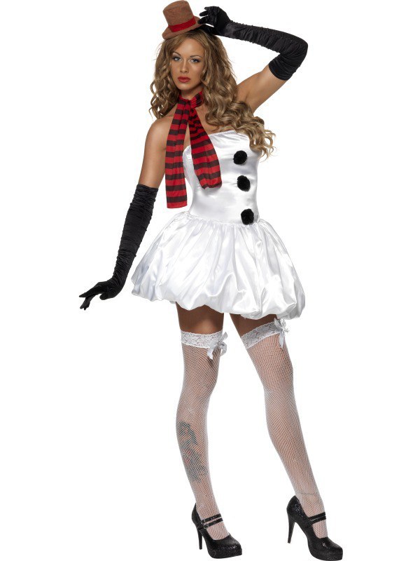 Cute and sexy, our Fever Snowman costume includes a white silk feel bubble hem style boob tube dress with black bobbles. Also included is a red and black striped scarf and clear bra straps to attach to dress. A brown and red mini top hat on hairband is also included.