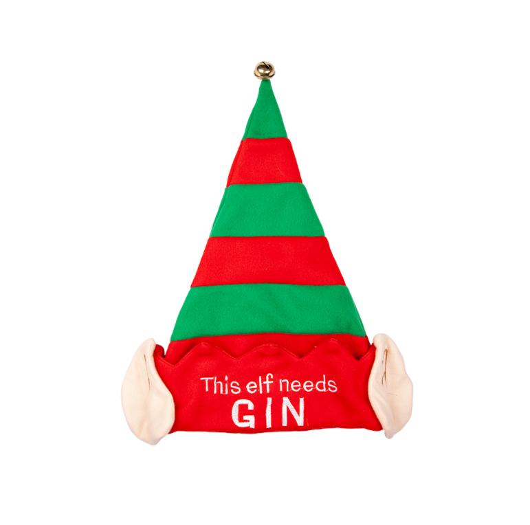 Green and red Christmas Hat with "This Elf Need Gin" on the front and elf ears attached on the sides.