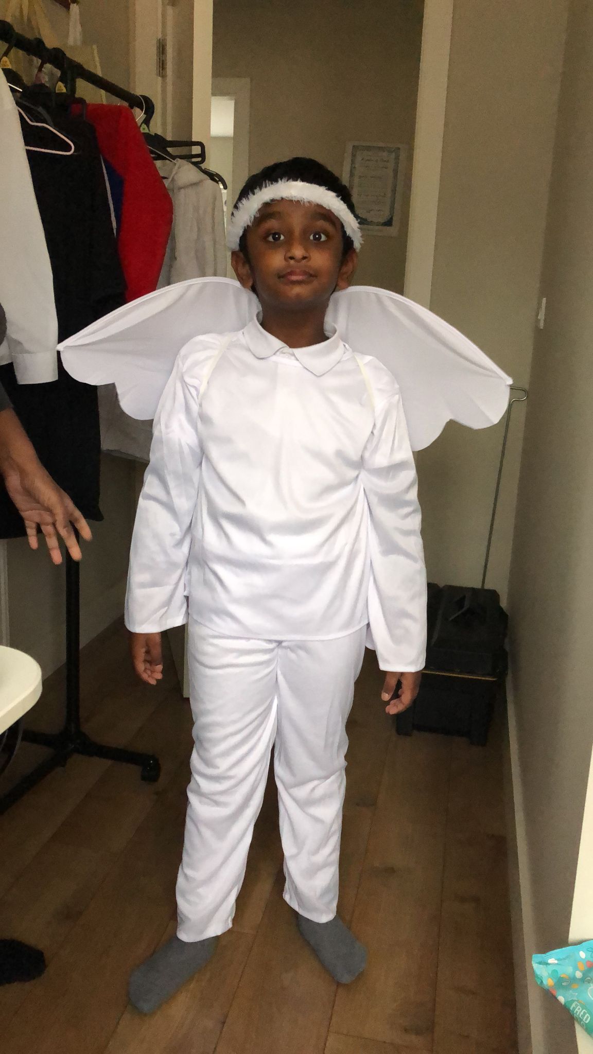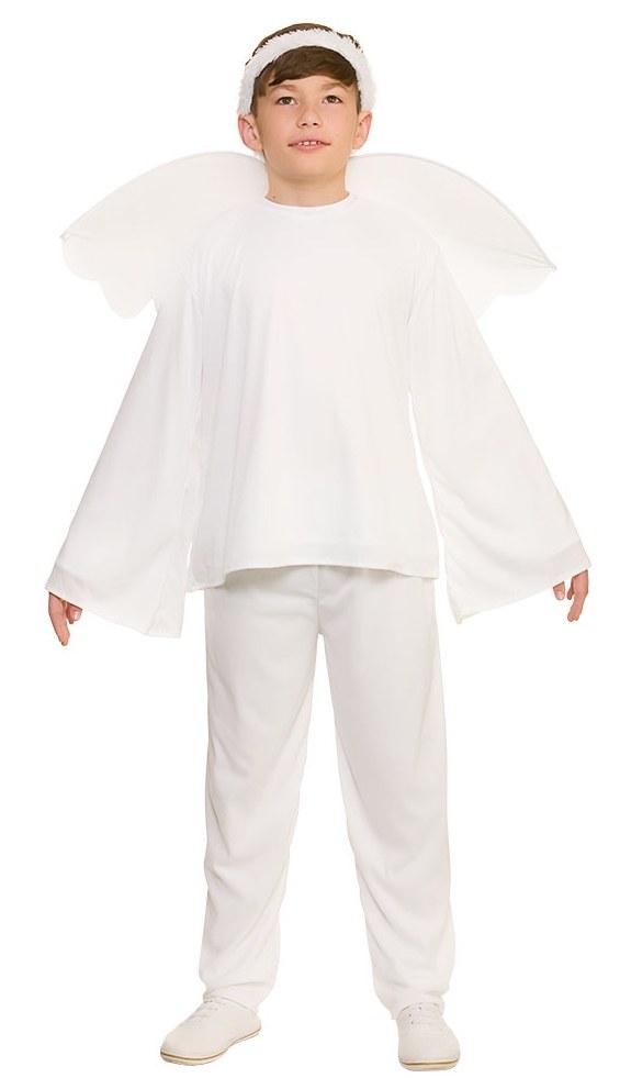 This Kids Christmas Angel unisex costume includes a long sleeved white shirt, white trousers and a pair of white Angel wings. To complete the look an Angel halo is also included.