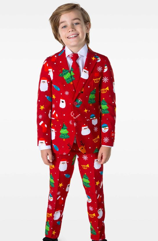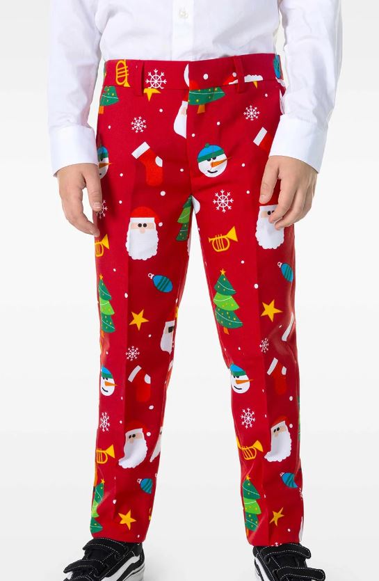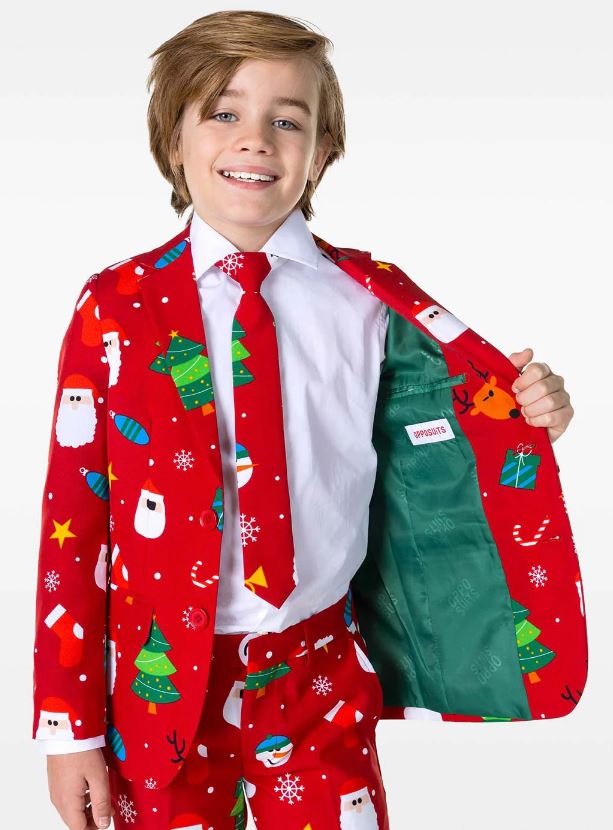 Kids Festivity Red OppoSuit includes a printed suit jacket and a pair of matching trousers. To complete the festive look a matching tie is also included.