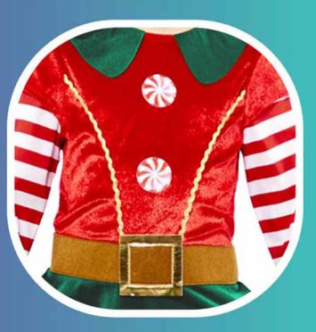- A charming green and red elf dress, complete with fun festive details like decorative buttons and a candy-cane striped trim.