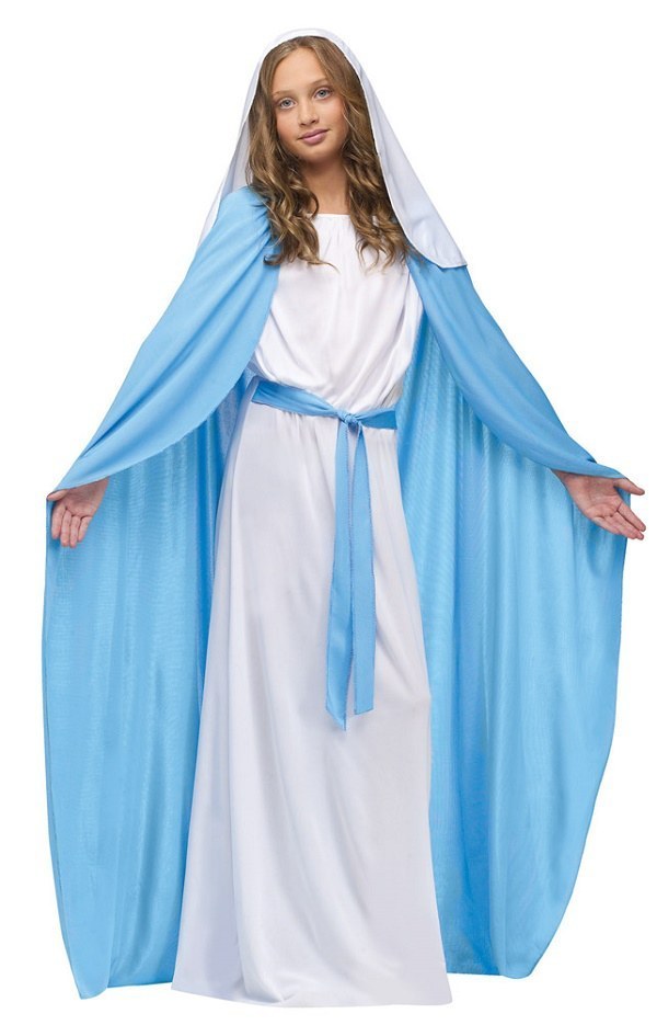 Teen Mary costume includes a long white gown with attached blue belt and a long blue cloak.