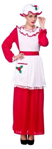 Mrs Santa Claus and includes a long sleeved red dress with lace neckline and an attached white apron with pocket detailing. To complete the look a co ordinating hat is also included.